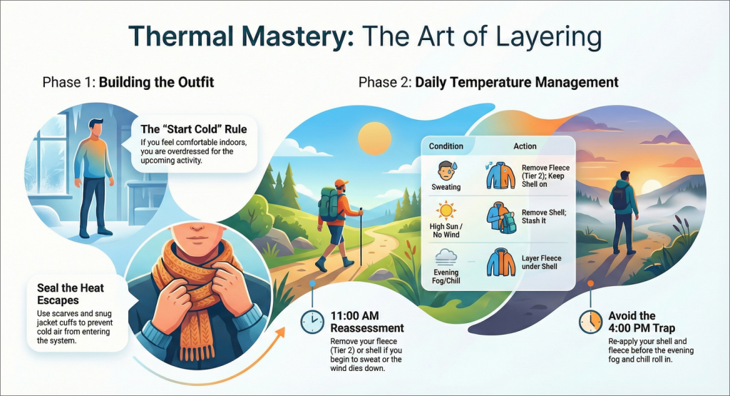 This guide teaches you the 3-Tier Microclimate System. It focuses on what to wear, how to take it off, and how to carry it when the fog returns.