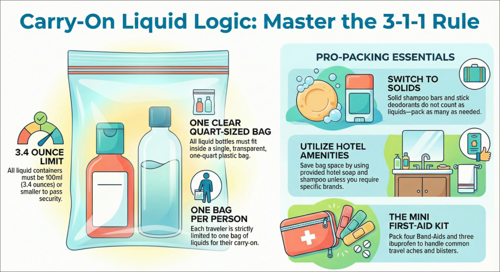 - Solid deodorant and solid shampoo bars do not count as liquids. Pack as many as you want.